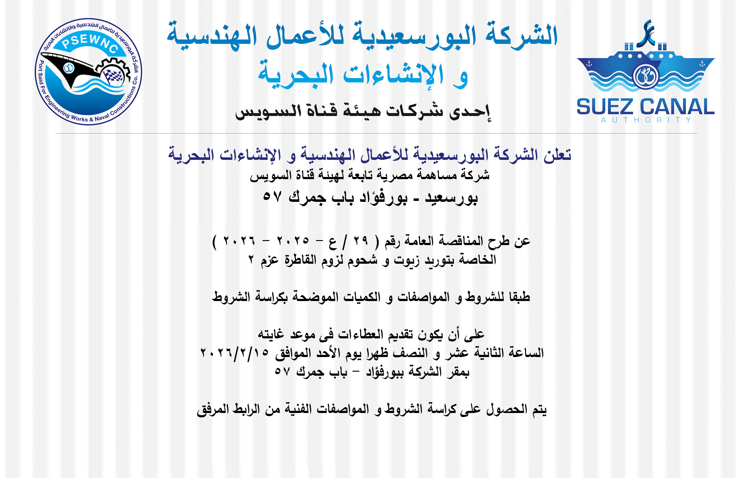 المناقصة العامة رقم ( 29 / ع – 2025 – 2026 ) الخاصة بتوريد زيوت و شحوم لزوم القاطرة عزم 2 – تم تعديل كراسة الشروط و المواصفات بتاريخ 9-2-2026 Posted by admin In Tenders كراسة الشروط و المواصفات pinup казино تم تعديل كراسة الشروط و المواصفات بتاريخ 9-2-2026 pinup казино DOWNLOAD ATTACHMENT Share:
